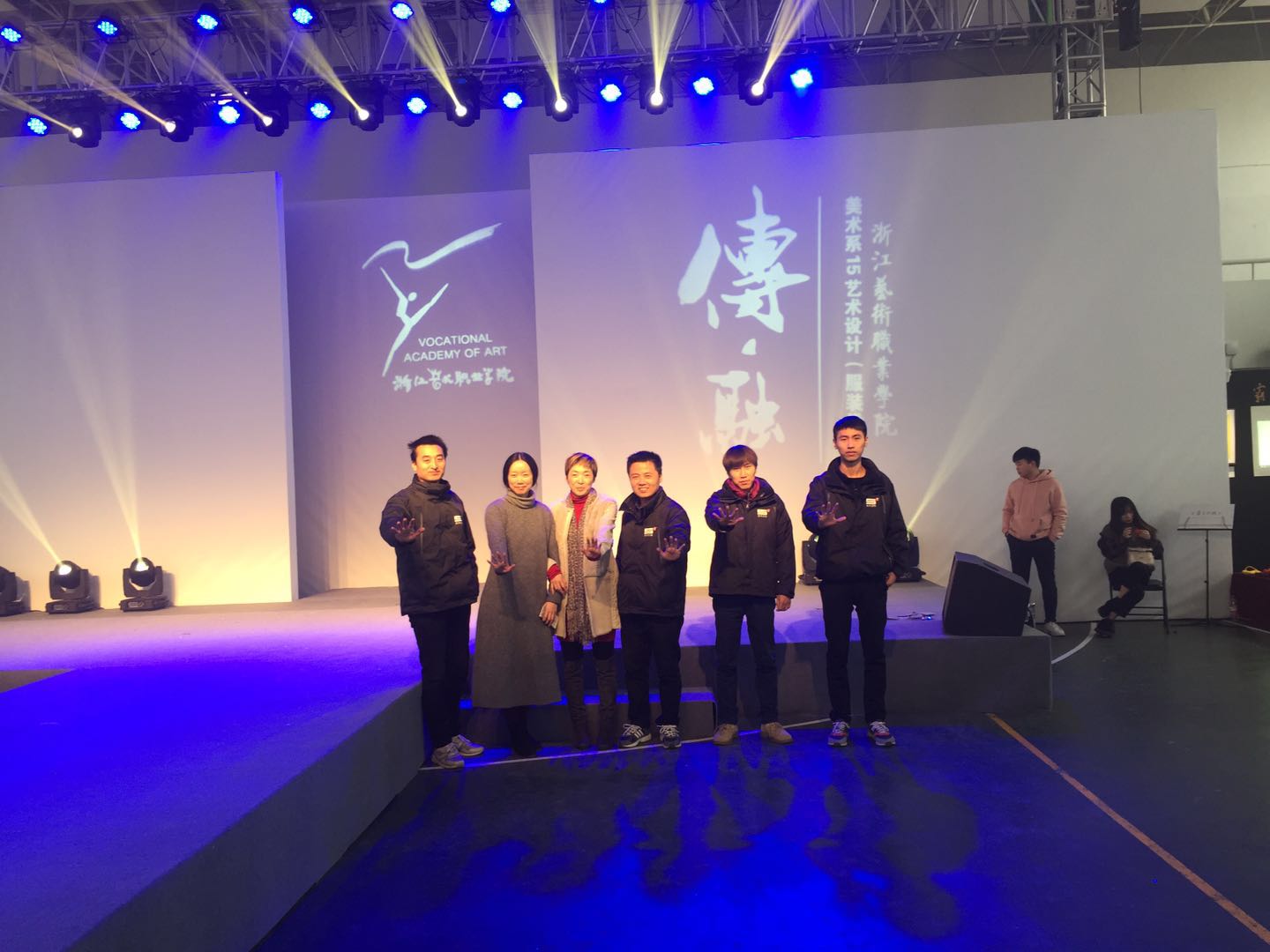 秀場負(fù)責(zé)人與伍方小伙伴共同比出伍方經(jīng)典手勢合照